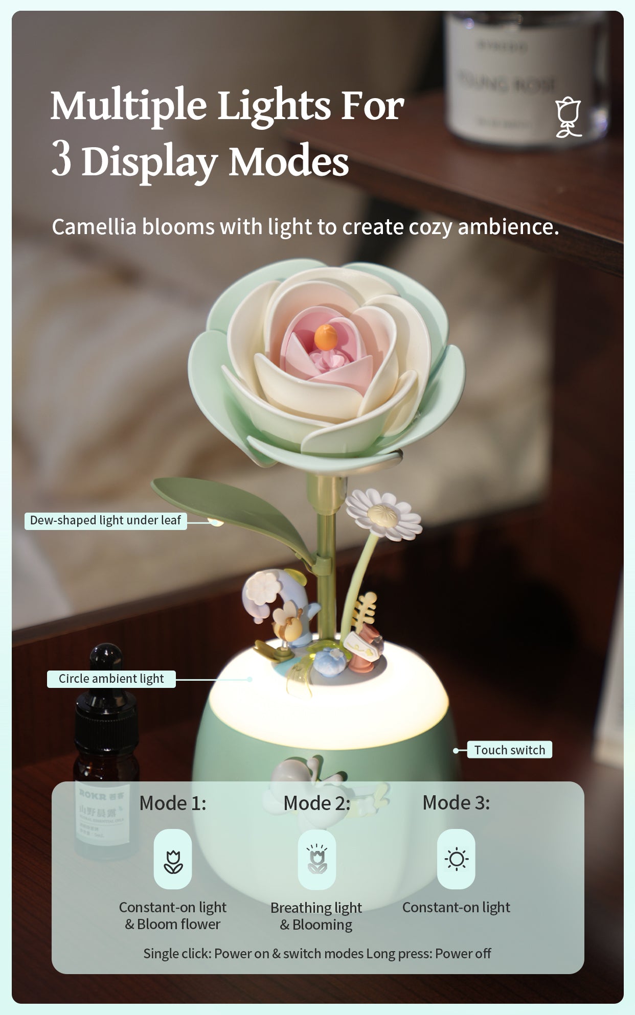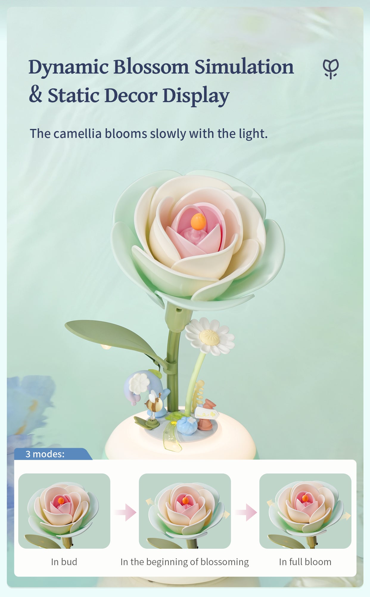 Place your mind and body in a restful, worry-free state with the help of the Minty Camellia Lamp and Flower Night Light. Be transfixed by its gentle blooming and relaxed with its subtle yellow glow.